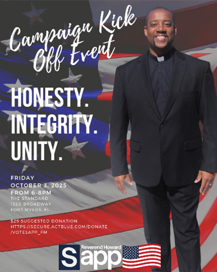 This week, (October 3), Howard Sapp will officially kickoff his campaign in downtown Ft. Myers at the Standard Restaurant at 1520 Broadway in what promises to be an exciting time for all. The event will start at 6pm with free valet parking.
