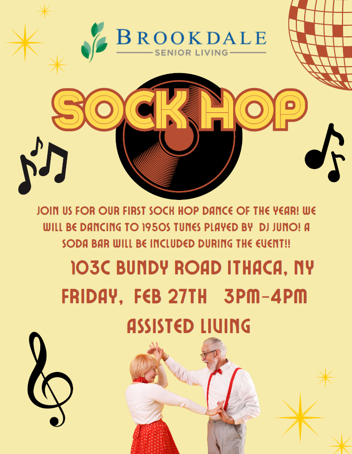 Join Brookdale Senior Living for their first Sock Hop dance of the year! They will be dancing to 1950s tunes played by DJ Juno! A soda bar will be included during the event!