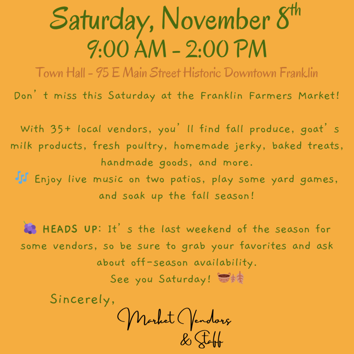 This Saturday is your last chance this season to catch Mashburn Branch Vineyard at the Macon County Market! Grown in the hills of Franklin, North Carolina, their vibrant Muscadine, Merlot, Petit Verdot, Cabernet Franc, Syrah, and Niagara grapes are a perfect pick for jam-makers, juice lovers, and creative kitchen experiments. Stock up and get inspired because these grapes are as local as it gets. 🍇🧃🌄