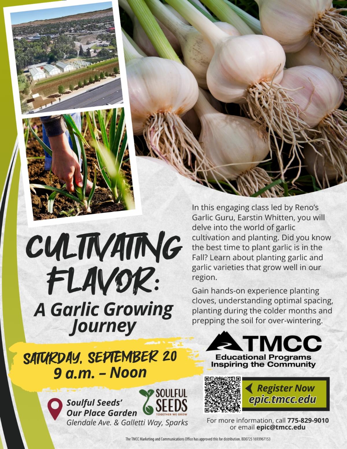 Soulful Seeds is proud to host Cultivating Flavor: A Garlic Growing Journey, a hands-on garlic planting class offered through TMCC’s EPIC program. Join us on Saturday, September 20 from 9:00 AM to 12:00 PM at the Soulful Seeds Garden at Our Place in Sparks for an immersive experience led by our Co-founder and Reno’s Garlic Guru, Earstin Whitten.