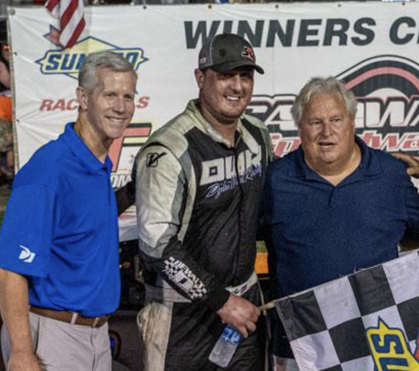 (Photo 16 of Ward, who won the 99-lap fendered portion of the annual Rusty Harpe Memorial, with representatives of longtime event sponsor and law firm Daggett & Shuler)