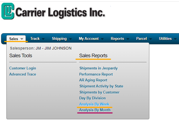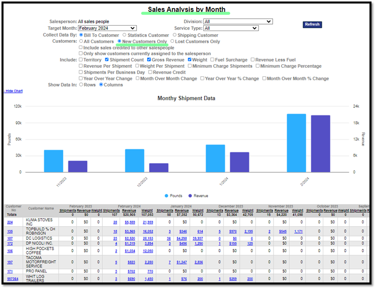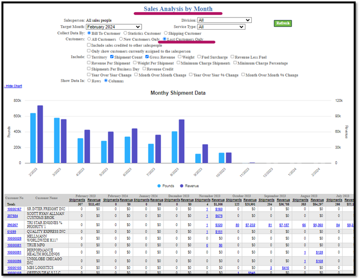 Among the Sales Reports are Analysis by Week and Analysis by Month, which contain a pivotal feature: the ability to filter and view Lost Customers. By selecting the "Lost Customers Only" checkbox, the module generates a report encompassing all customers assigned to the salesperson who have not had any freight movement in the past 60 days. This feature aids in identifying inactive or lost accounts, facilitating targeted strategies for customer retention or re-engagement.