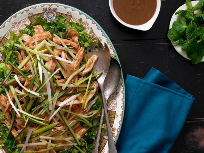 In a small mixing bowl, combine sauce ingredients with 2 tablespoons cold water, and mix until smooth. Cover and refrigerate until needed, up to two weeks. Spread lettuce over a large serving plate, and sprinkle evenly with cilantro and mint. Drizzle 4 to 5 tablespoons of Bang Bang sauce on top. In a small bowl, combine turkey with 4 tablespoons Bang Bang sauce, and toss until well coated. Arrange turkey strips in a rough line down center of salad. Top turkey with scallions and cucumber. Drizzle with more sauce, or place sauce in a bowl to pass at table.