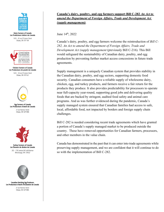 Chicken Farmers of Canada thank the Members of Parliament who supported Bill C-282, safeguarding the sustainability of Canadian dairy, poultry, and egg production by preventing further market access concessions in future trade agreements.