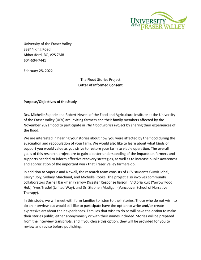 Drs. Michelle Superle and Robert Newell of the Food and Agriculture Institute at the University of the Fraser Valley (UFV) are inviting farmers and their family members affected by the November 2021 flood to participate in The Flood Stories Project by sharing their experiences of the flood.