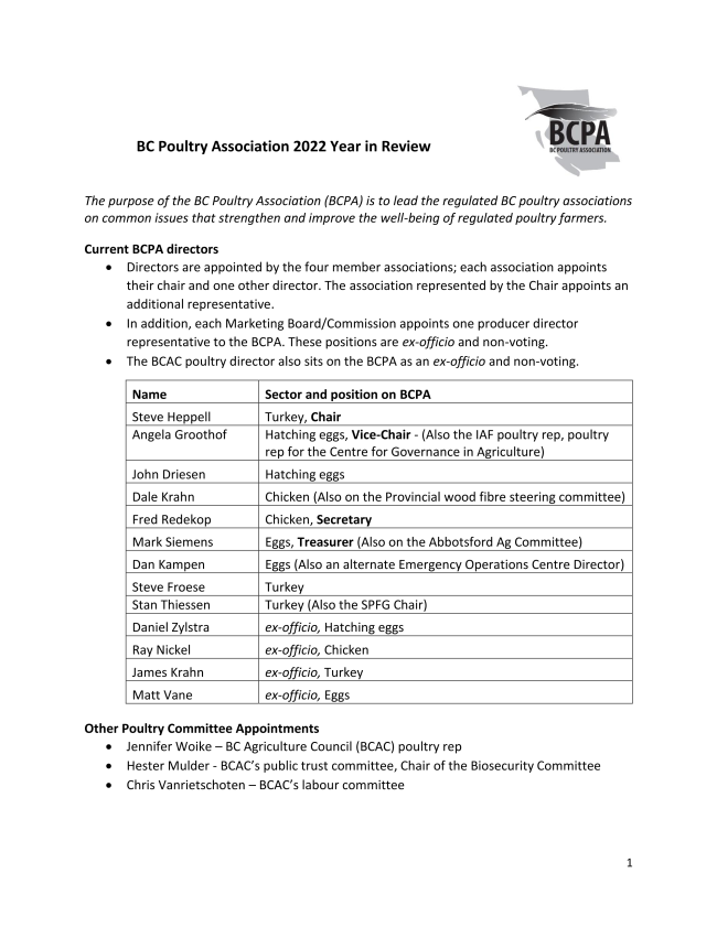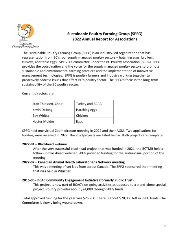 The Sustainable Poultry Farming Group (SPFG) provided funding for a blackhead webinar, the Canadian animal health laboratorians meeting and the BC Agriculture Council's community engagement initiative. There is about $70K left in SPFG funds and the committee is slowly being wound down. Read the full report here.