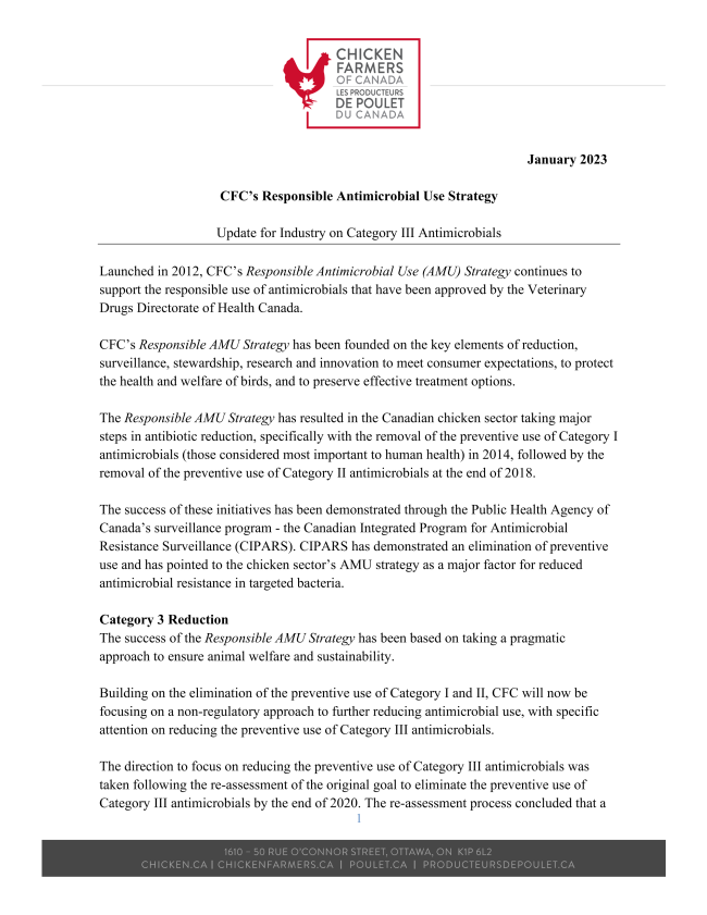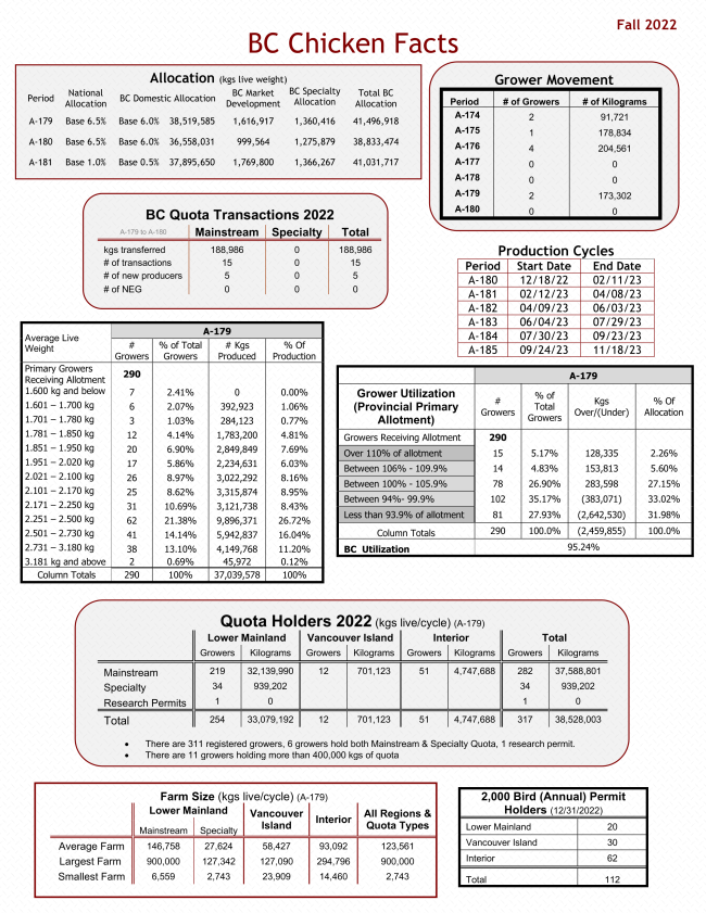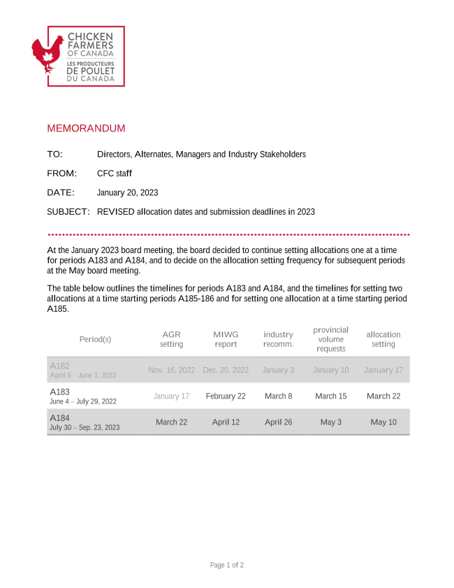 The allocation for Period A-182 (April 9 to June 3, 2023 ) was set by the Chicken Farmers of Canada Board of Directors on January 17, 2023 at 0.5 % above base as follows (in KG LIVE weight.)