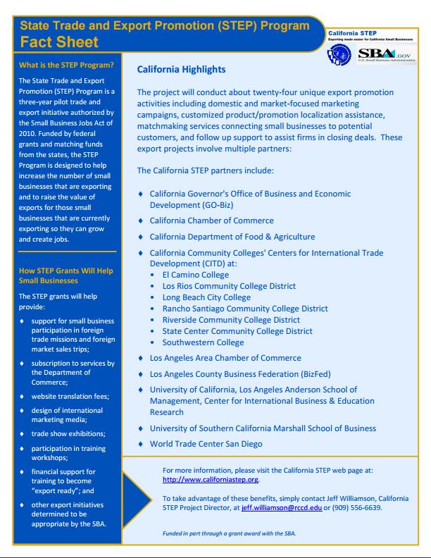 , funded in part by a grant from the U.S. Small Business Administration, facilitates export promotion activities, serving targeted industries to drive exports for small business.
