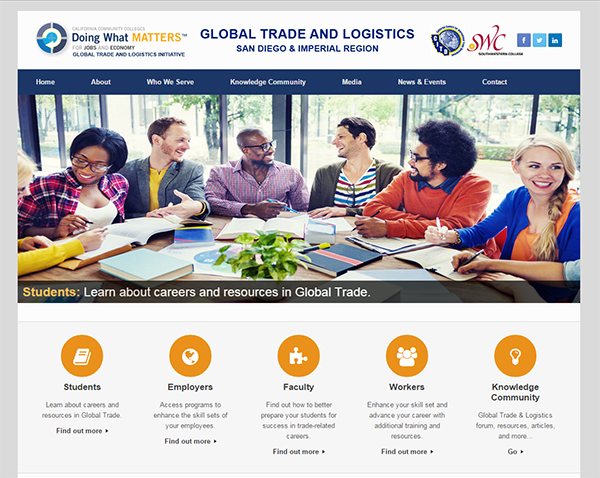 Part of the California Community Colleges "Doing What Matters for Jobs and the Econony" initiative, the DSN for Global Trade & Logistics is focused on aligning curriculum and training programs in International Business and Logistics, across the community colleges in the San Diego & Imperial Counties region, to meet industry needs and help students develop successful career paths in high-growth, high-wage industries.