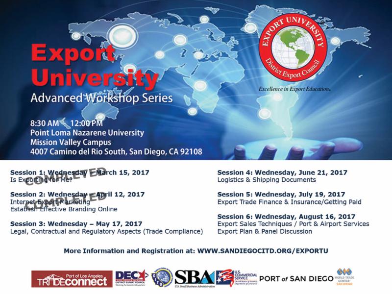 Export University on May 17th from 8:30AM to 12:00PM at Point Loma Nazarene University in Mission Valley. This session will focus on Legal, Contractual, and Regulatory Aspects (Trade Compliance). Topics that will be covered include:
