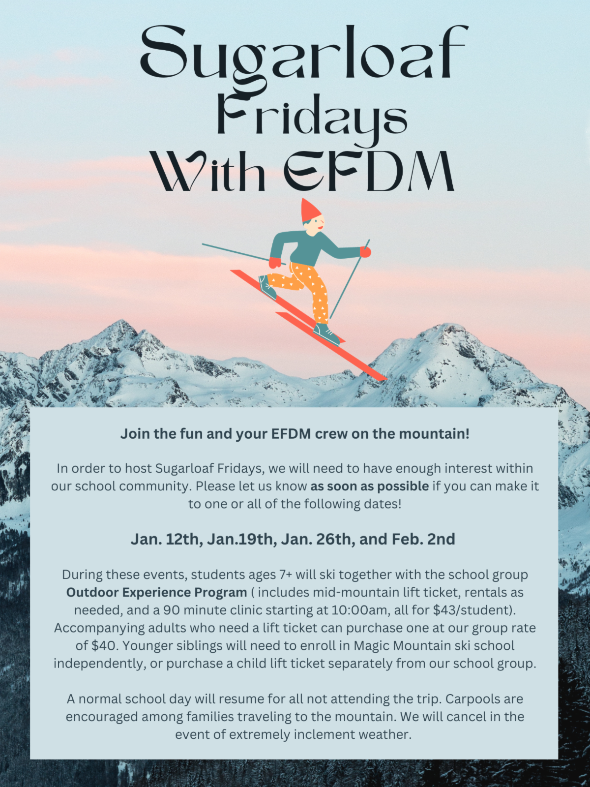Our 2024 Sugarloaf Fridays are halfway over! We've had a blast at the first and second events and look forward to more days on the slopes with the EFDM group. Thanks to all for helping make these memories special! For those who remain at school on these Fridays, special projects and certain fun are the name of the game!