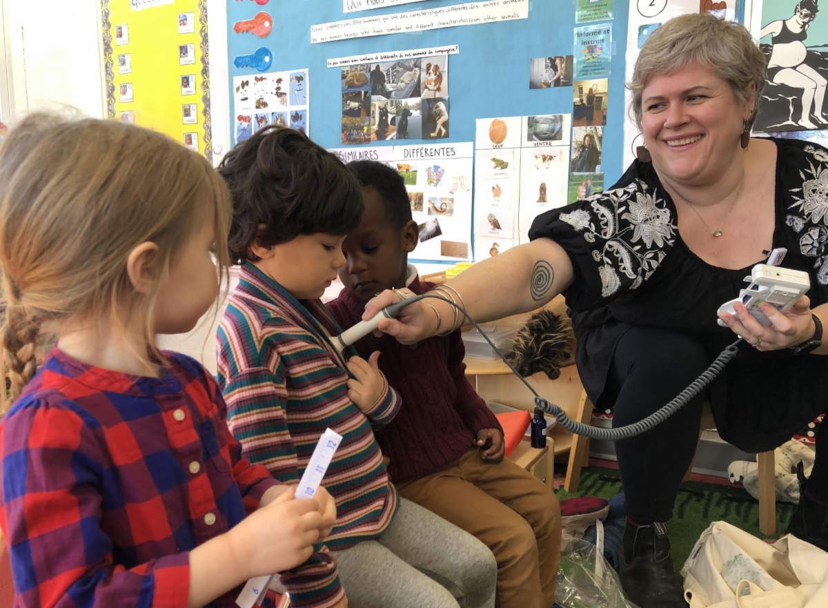 This week in Petite Section we had a visit from Aoife, a local midwife, who spoke with us about how she helps moms during pregnancy. We learned how babies grow and develop and how they get nutrients from their mothers. We saw a model of a uterus and a placenta and discovered how babies are positioned before they are born. Aoife showed us how she listens to a baby's heartbeat and we even got to listen to our classmate's heartbeats! | |