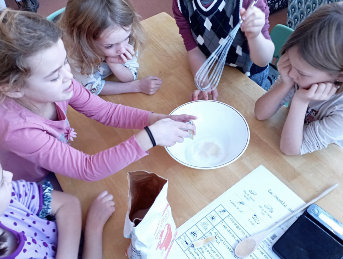 As an EFDM student, you don't have to be in Anaelle's cooking club to try your hand at cooking! To celebrate the Thanksgiving holiday, CP and CE1 students measured, mixed, and made some delicious treats! They followed their recipes with great concentration, and enjoyed their cookies with delight! | |