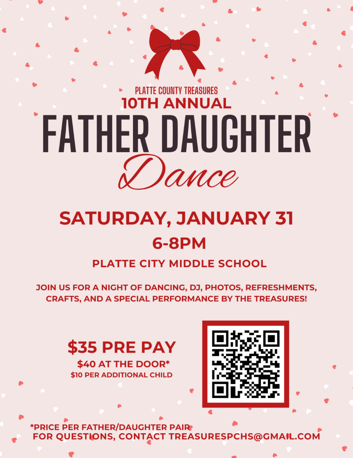 The PCHS Treasures Dance Team is inviting all girls in grades preK-5 to invite their dad, uncle, grandpa, mentor, etc. for a night of music, dancing, photos, and more! Sign up by clicking here and see flier for details.