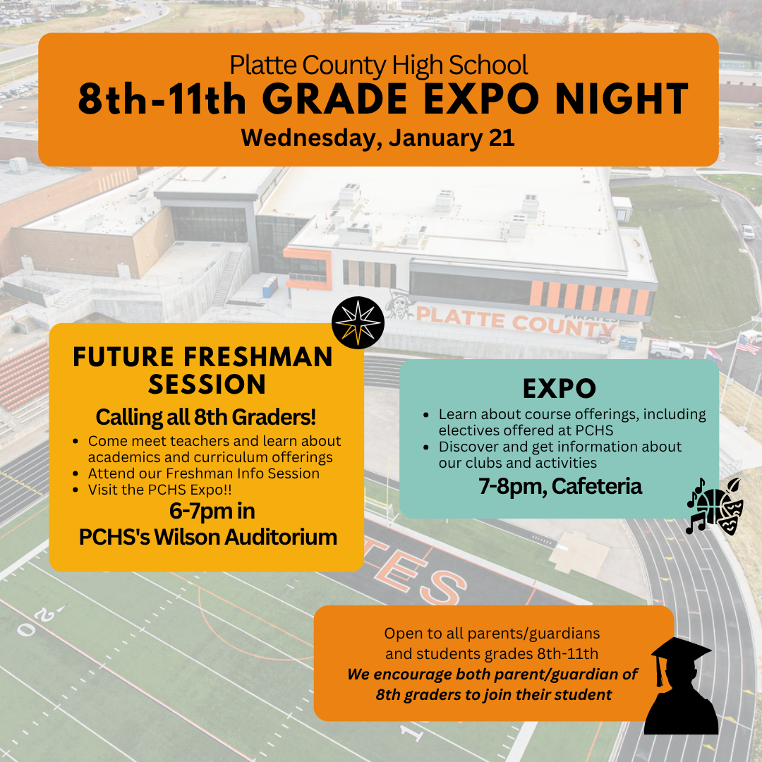 FUTURE FRESHMEN: We encourage both the student (current 8th graders) and parent(s) to attend, so that all can receive the information about courses offered at Platte County High School. This will greatly assist you and your student in the planning process and in course selection for the 2026-27 school year. If you would like more information, please contact your student's counselor: Kim Schank or Whitney Edman, Platte City Middle School Counselors, or Ashley Koenigsfeld, Platte Purchase Middle School Counselor.