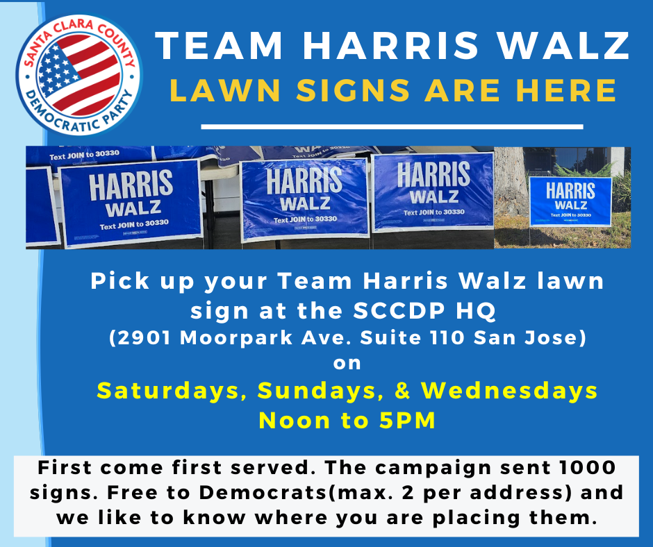 Team Harris Walz signs are at the Santa Clara County Democratic Party HQ