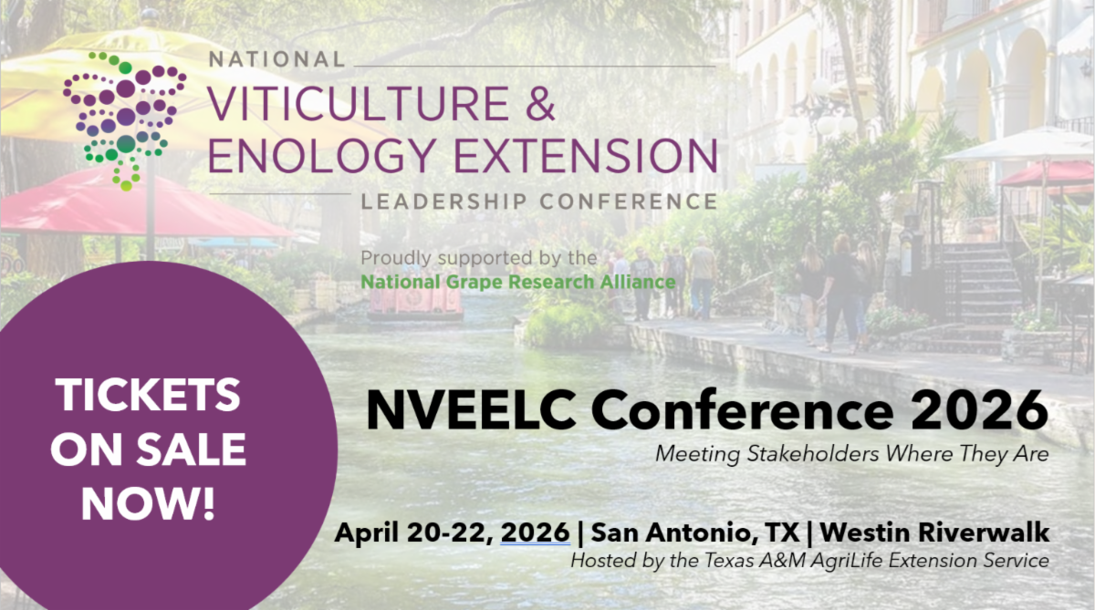 If you work in viticulture or enology extension and/or outreach, now’s your chance to secure your spot for this year’s National Viticulture and Enology Extension Leadership Community (NVEELC) Conference! Planned by the NVEELC Organizing Committee, supported by NGRA and hosted by the Texas A&M AgriLife Extension Service, NVEELC 2026 will be held at the Westin Riverwalk in San Antonio, TX, April 20-22, 2026. With the theme, “Meeting Stakeholders Where They Are,” the program will be full of opportunities for professional development, networking and best-practice sharing to help V&E Extension and outreach specialists sit tall in the saddle. Plus, a tour of four pioneering vineyards and wineries will show how producers in this fast-growing region are winning new consumers with creative winemaking, packaging and programs that break the traditional mold. See the complete agenda.