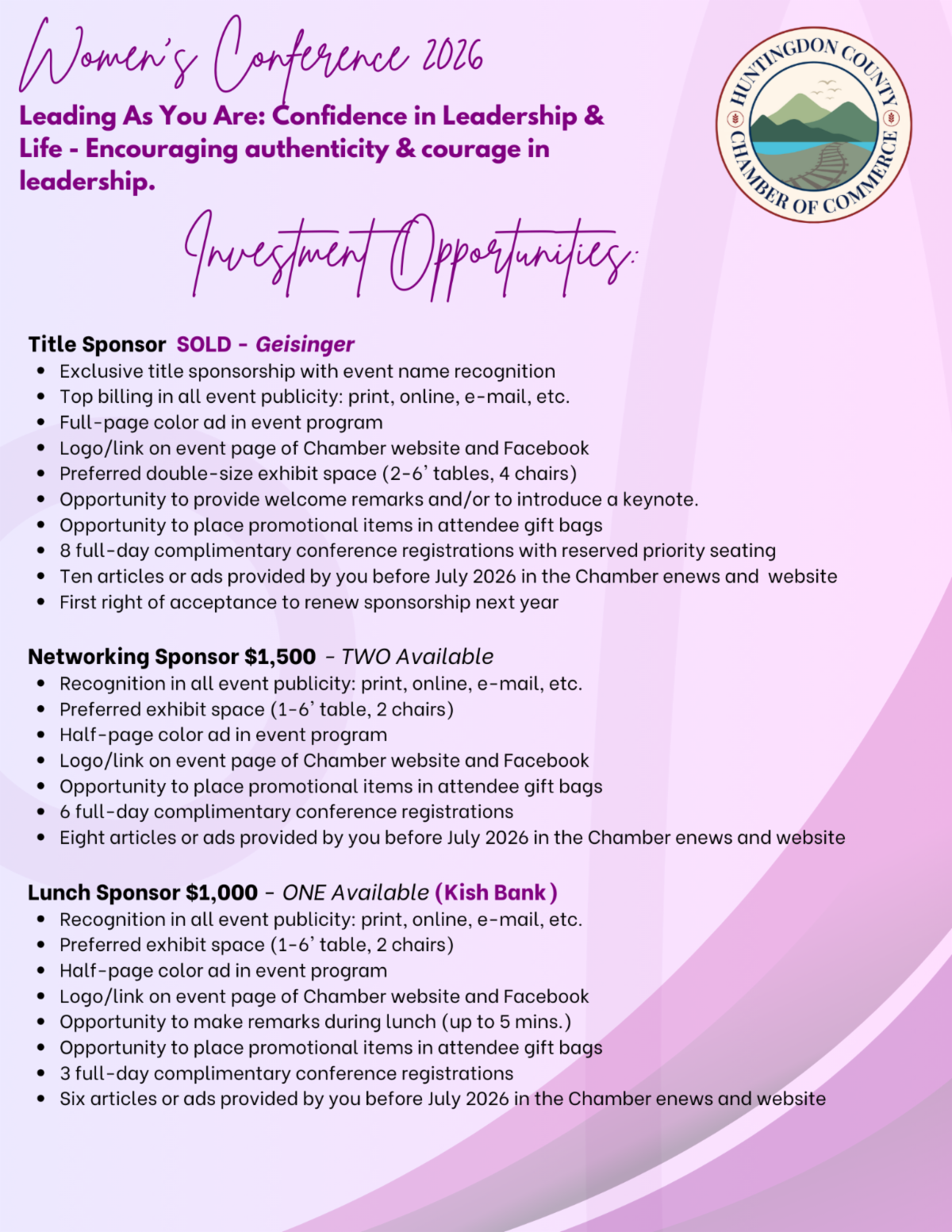 We would the opportunity to partner with you and highlight your commitment to leadership, growth, and community engagement. Sponsorship opportunities offer visibility, connection, and the chance to directly support women as they lead in business, organizations, and life.