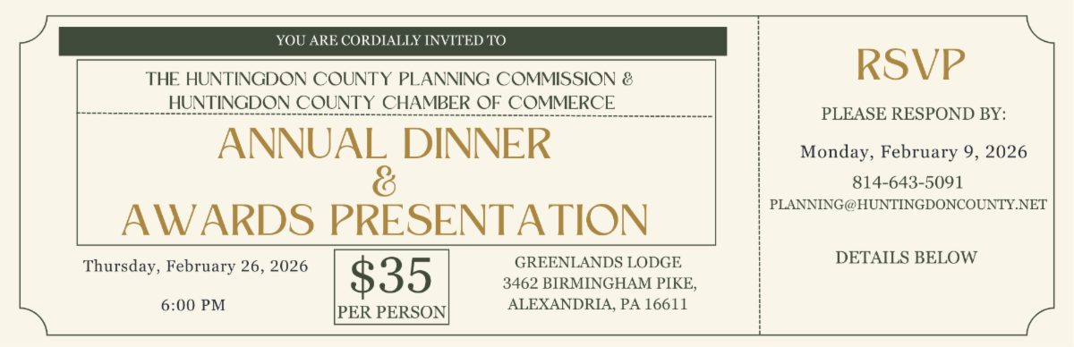 The Annual Dinner Meeting of the Huntingdon County Planning Commission will be held Thursday, February 26, 2026 at Greenland's Lodge. Doors will open at 6:00 p.m. for a networking reception and cash bar, followed by dinner at 6:30 p.m. The menu includes: a salad bar, roast beef, turkey, mashed potatoes, beef gravy, gourmet vegetable blend, dessert bar, and beverages.