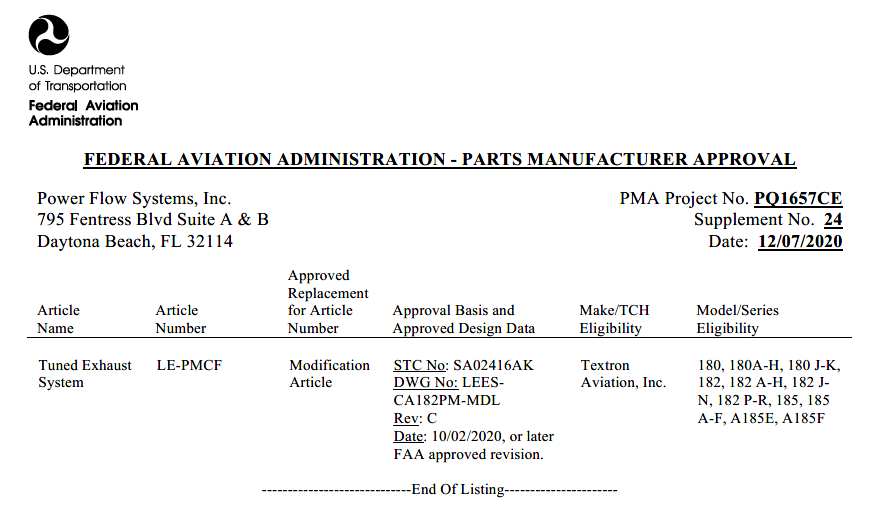 This initial PMA is for the manufacture of the original Power Monster Cross Flow systems designed by Dane Wagner for the O- and I/O- 470, 520, & 550 powered Cessna -180, -182, & -185 airframes.