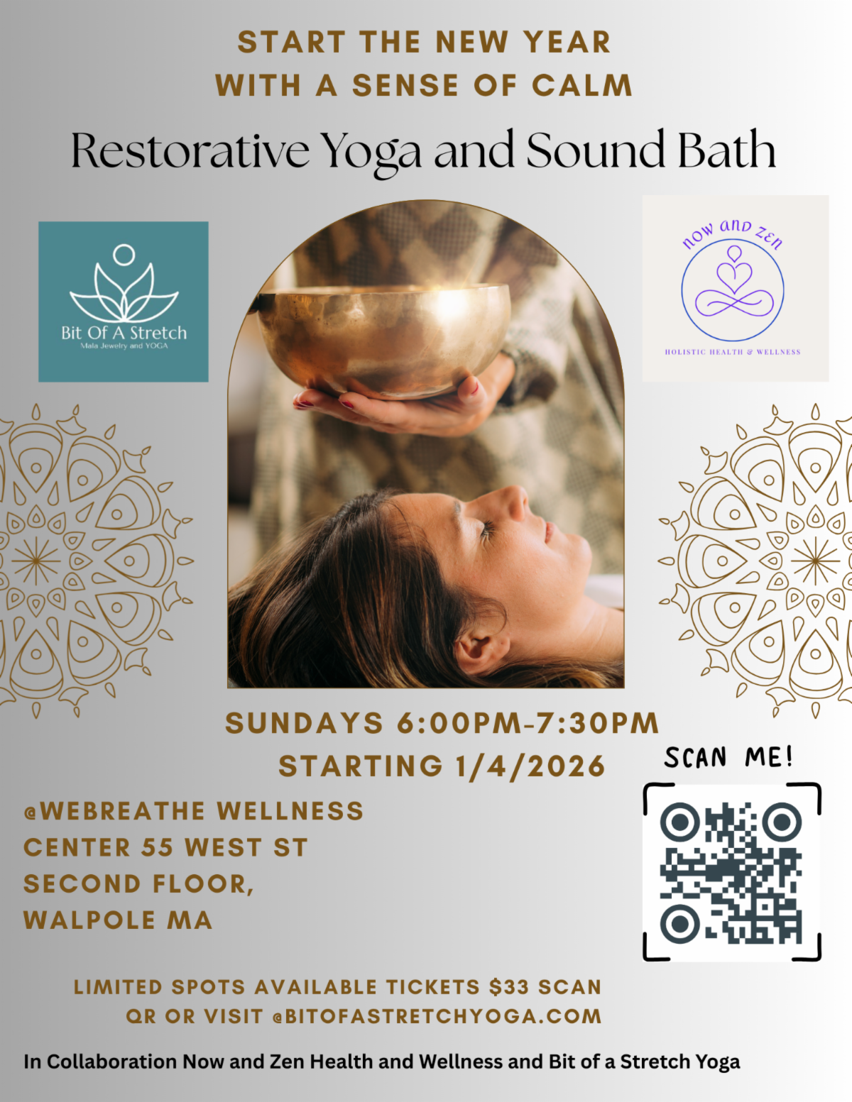 Join Nancy and Sadie Sunday evenings for a deeply calming experience designed to help you unwind, reset, and gently prepare for the week ahead. This offering begins with 45 minutes of restorative yoga, using supportive props and long, nourishing holds to soften the body and quiet the nervous system. You’ll then be guided into a sound bath, allowing soothing tones and vibrations to support deep rest, integration, and balance. Accessible to all levels. No prior yoga or meditation experience needed. Please wear comfortable layers and bring anything that helps you feel cozy. Tickets-$33