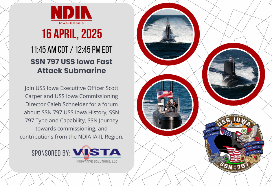 Discussion points include: SN 797 USS Iowa History, SSN 797 Type and Capability, SSN Journey towards commissioning, and contributions from the NDIA IA-IL Region.