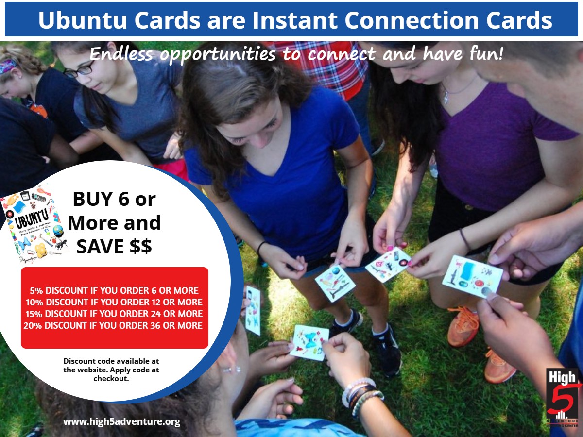 Ubuntu cards are a multi-functional deck of 54 colorful cards that encourage a group to interact, find connections, and have fun! They are easy to use, portable to take outdoors, and immediately encourage groups to find things in common and to start talking and laughing. To help jumpstart those vital human connections, we'd like to make it easier for you to bring Ubuntu cards to your entire school, camp, or organization - so, we're passing along a bulk discount. The more you buy, the more you save. Order a bunch today!