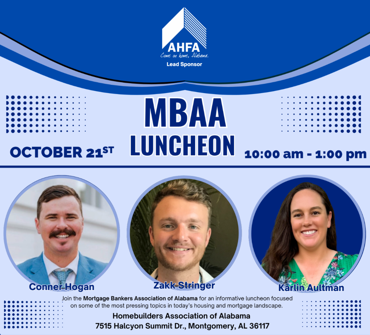 AHFA is the lead sponsor of an upcoming event for the Mortgage Bankers Association of Alabama, featuring the newest member of AHFA’s Business Development Team, Karlin Aultman. Three key speakers will focus on some of the most pressing topics in today’s housing and mortgage industry.