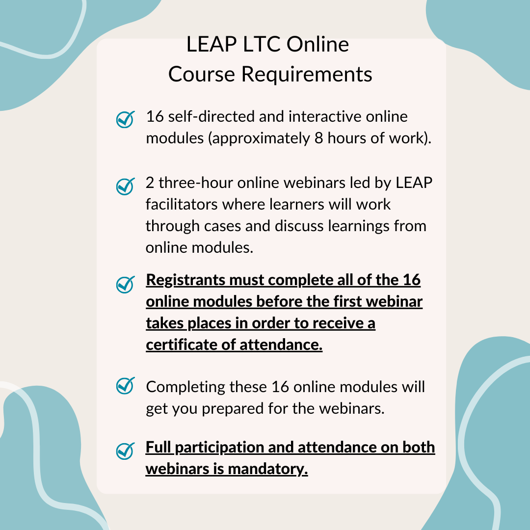 • 2 three-hour online webinars led by LEAP facilitators where learners will work through cases and discuss learnings from online modules. Personal support workers/care aides have specific case studies contextualized to their role.