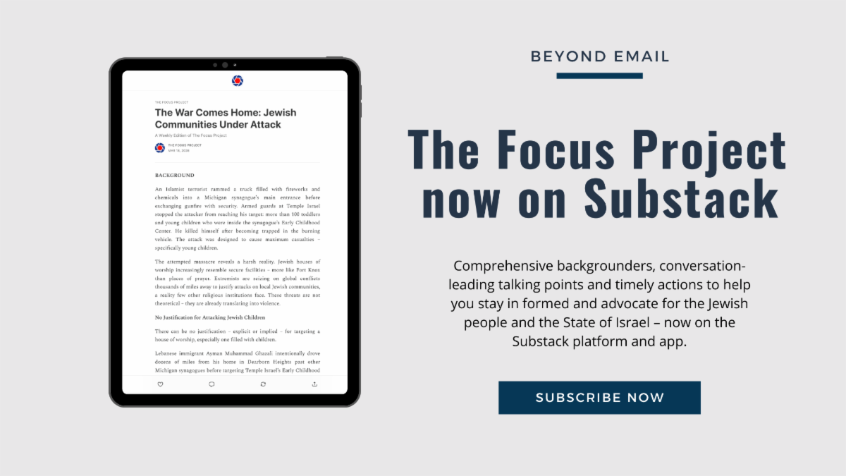 Recognizing that hatred of Jews comes in many forms and directions, we strive to address all sources as they arise, and educate our growing audience on topics ranging from inter-religious relations to relevant international developments. From week to week, we may focus on issues arising from the political left, university campuses, from the political right and from institutions, government, and corporations. We don’t try to address all issues in each edition. We hope you will find this information useful in your writing and/or speaking. We are always open to your feedback: info@focus-project.org.
