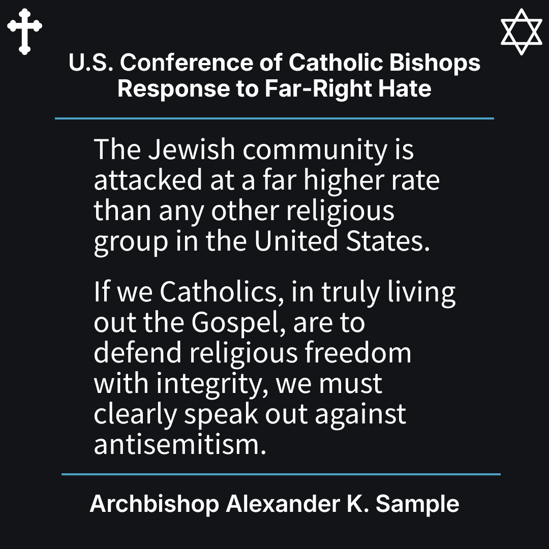 Religious institutions are responding to these false narratives. After a fringe Catholic group expressed support for these media personalities, the U.S. Conference of Catholic Bishops released a statement calling on Catholics to reject anti-Jewish hatred. The Conference signaled concern over the spread of rhetoric portraying Jews or Israel as exerting hidden control over American policy and global events. Archbishop Alexander K. Sample stated: “As Catholics, we are called to walk in the truth and so to reject the conspiracies and lies that lead to harassment and even violence against our Jewish brothers and sisters.”