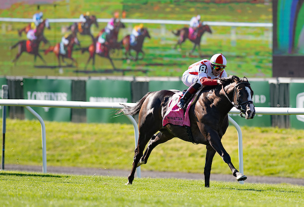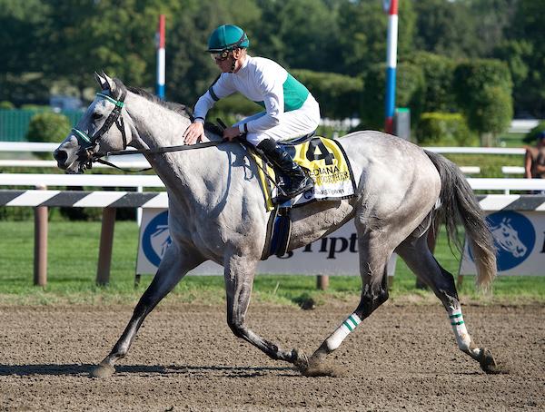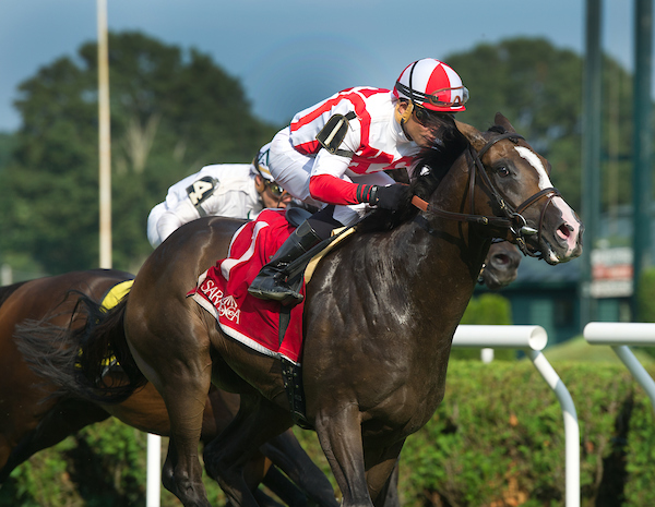 photo of Bricks and Mortar winning the 2017 National Museum of Racing Hall of Fame Stakes (Gr. 2) with jockey Joel Rosario)