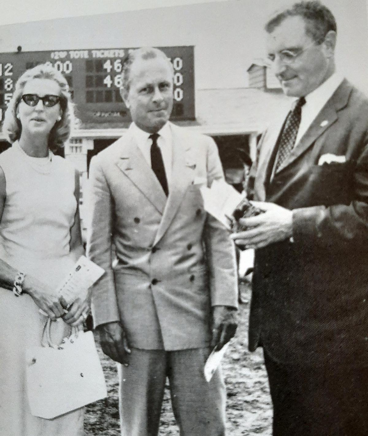 Mr. and Mrs. Strawbridge Sr. in the paddock at Monmouth Park in 1964 with Reeve Schley.