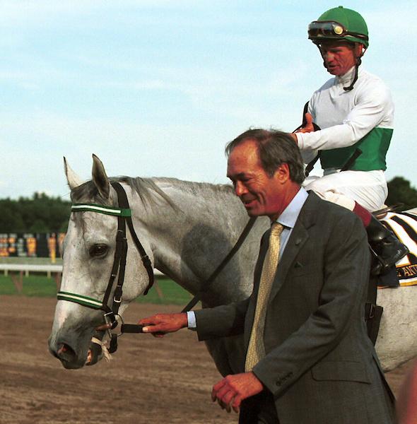 photo of Strawbridge leading With Anticipation and jockey Pat Day to the winners circle after the 2001 Sword Dancer)