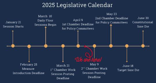 We are halfway through the session, and things are going to start heating up. Earlier this week we had the First Chamber deadline, meaning if a bill did not pass out of its policy committee in its chamber of origin, it's dead. So check back in on the bills you have been following, and see if they made it!