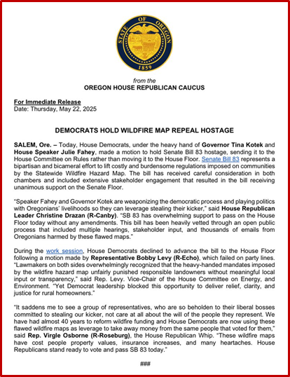 Senate Bill 83 represents a bipartisan and bicameral effort to lift costly and burdensome regulations imposed on rural Oregonians through the state’s flawed wildfire hazard map. Despite unanimous support on the Senate Floor, House Democrats blocked the opportunity to deliver relief, clarity, and justice for rural homeowners.