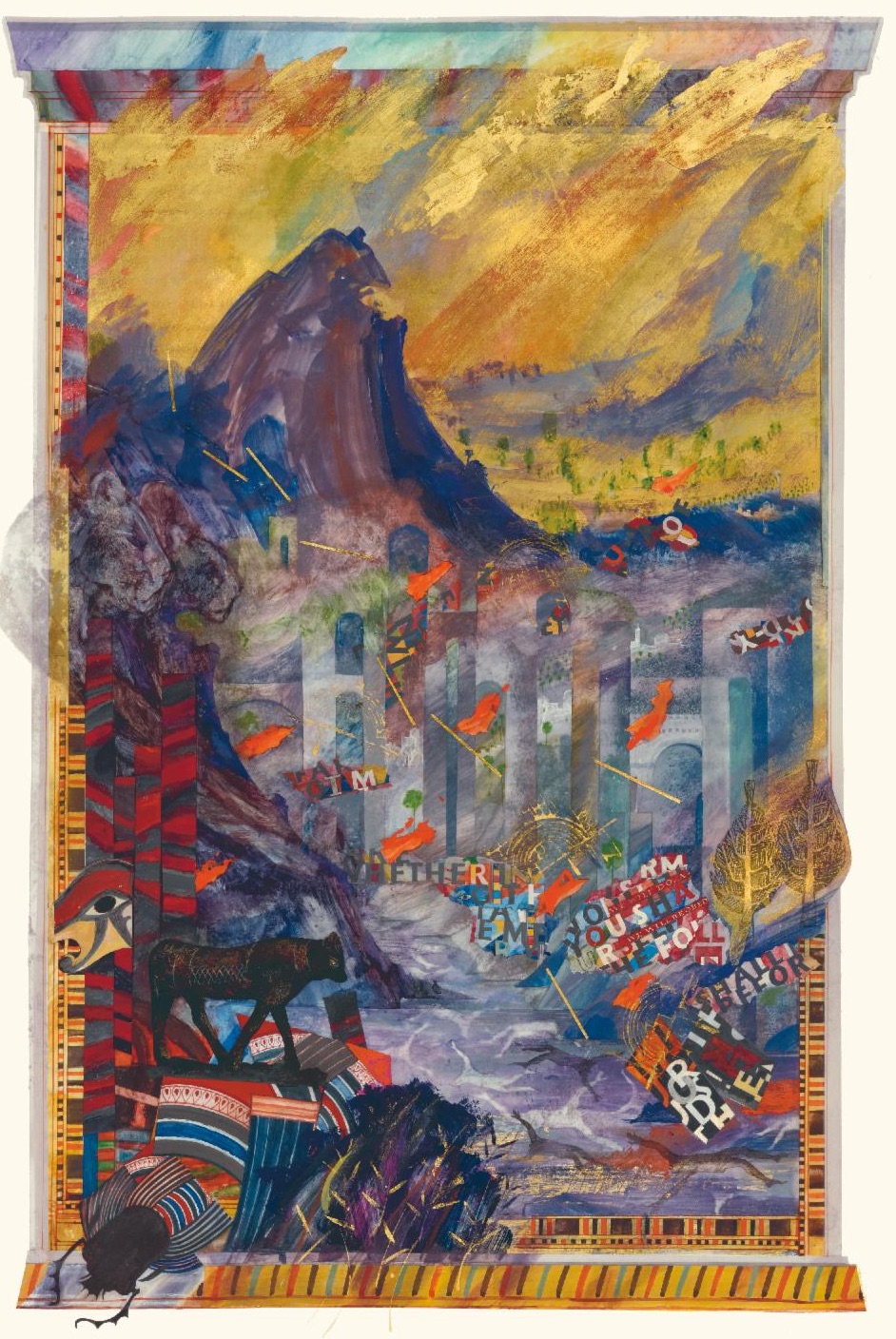 The Joshua Anthology is a striking visualization of life, faith, and struggle. What first strikes me in the image is the chaos. The golden sky – the presence of the divine – battling with dark clouds, the cities burning, the ghostly figures drifting through the river.