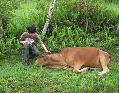 Inevitably during our time in the beautiful mountain village of Arroyo de Toro, as part of learning about the community, we hike over dirt roads and narrow paths. Farmers guide and lead us to their fields where the crops are grown that help enable this community to survive. To actually enter into these fields, we always need help. The reason for this is that the fields are protected from cows and horses by way of barbed wire fences. Trying to negotiate the space between one strand of barbed wire and the next, by oneself, takes acrobatic grace, no loose clothing and perhaps a thinned down version of one’s body. I don’t recommend it, and neither do my torn and ripped jeans. The only sure way to more easily and safely make it through the wall of menacing wire is to have assistance. Helping 12 people through the twisted wire on the way to a spectacular view of the village, fields and distant ocean took some effort but it was well worth it. The action of the helpers and the yoga like moves of the participants through this obstacle left me with a fixed image.