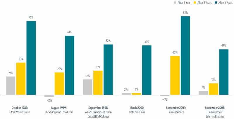 helps illustrate this point. The exhibit shows the performance of a balanced investment strategy following several crises, including the bankruptcy of Lehman Brothers in September of 2008, which took place in the middle of the financial crisis. Each event is labeled with the month and year that it occurred or peaked.