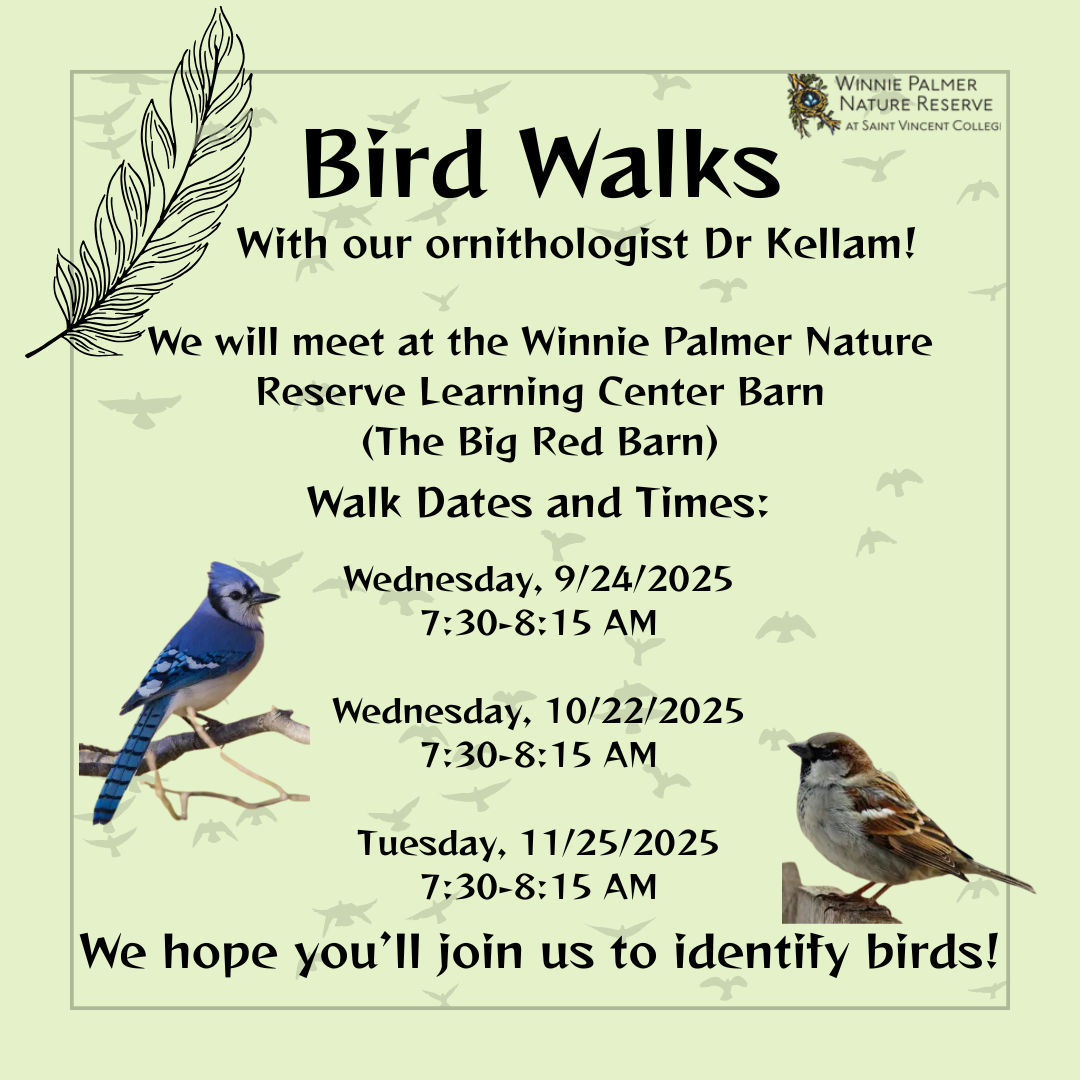 Executive Director, Winnie Palmer Nature Reserve | | Our trails are groomed and ready for your exploration. Thanks to Friendship Farms Native Plant Nursery and Bakery that worked diligently to enhance our landscape to meet our safety and conservation strategies. The pond has been stripped of some invasive plants, our trails have been widened, and new interactive discovery trail signage are being developed. | | | Birdwalks with Dr. Kellam | | We value our connection with our faculty at Saint Vincent College, it is what makes Winnie Palmer Nature Reserve (WPNR) unique in our programming and commitment to connecting real science to our work. We take immense pride in our collective effort to create a unique space that invites the community to connect with the natural world and faculty research. We invite you to join our ornithologist in a bird walk or two. | | Nature Play for Tiny Ones | | Have you been wondering where our beloved mud kitchen has gone? Well, it’s been carefully tucked away, waiting to make its grand debut in our upcoming Nature House play space! We are thrilled to share that this enchanting area will be designed in accordance with Nature Explore Certification guidelines, featuring a delightful kitchen, cozy living room, inviting library, imaginative playroom, and so much more! Here, visitors will have the unique opportunity to borrow tools and engage deeply with nature, turning playtime into a magical experience of experimentation and creativity. Not a playground, our Nature House will celebrate the beauty of play in its purest form, encouraging little ones to explore, create, and discover. We kindly ask our visitors to embrace the "leave no trace" philosophy by tidying up and returning items for the next tiny adventurers, ensuring that our natural messages remain untouched. Are you curious about what enchanting experiences await? We can’t wait for you to join us in this nurturing space where families can connect with nature and each other! |