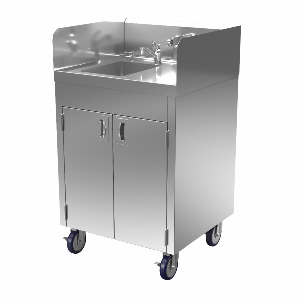 Efficient solution for facility areas with restricted or limited availability of plumbing, while ensuring appropriate levels of hygiene. Faucet blends hot and cold water. UL listed water heater and pump. 5 gallon clean water storage and 6 gallon waste water storage. Soap dispenser and paper towel holder. 5 Gallon clean water storage and 6 gallon waste water storage. Faucet blends hot and cold water. 110o F water supplied at .32 GPM. NSF