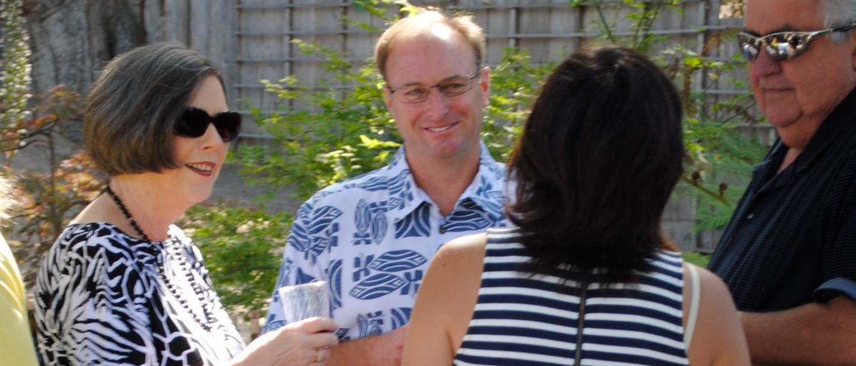 | | Bev and husband Gary speaking to Mark and Jill Kennedy at Summer Soiree 2014 | |