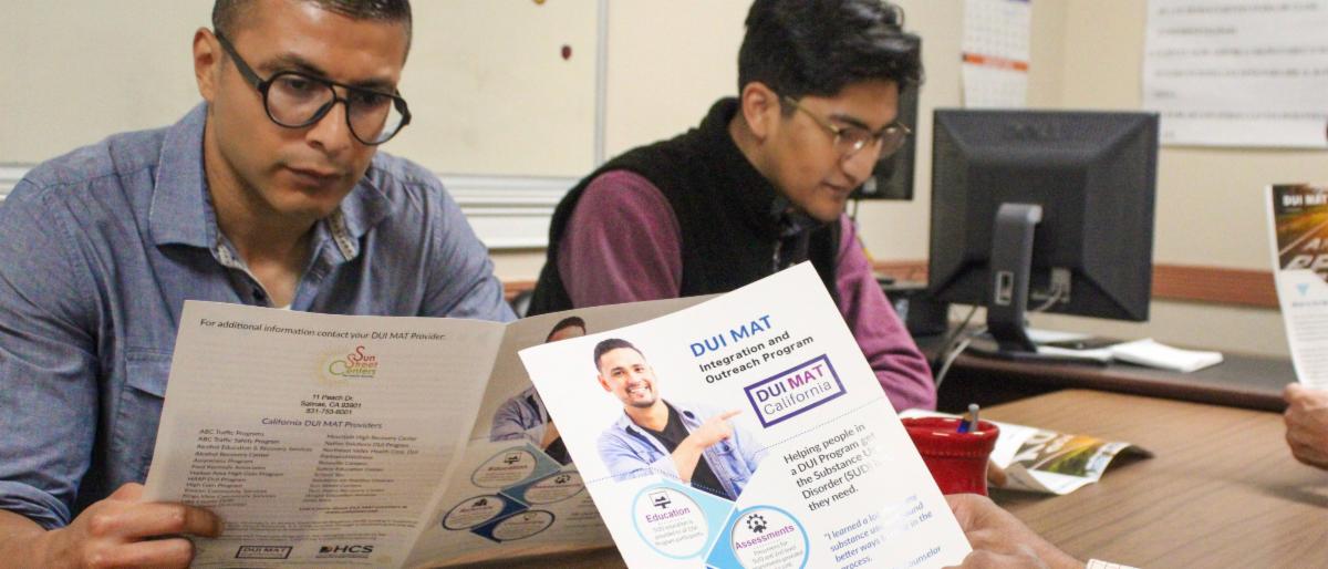 | | DUI Program Manager, Cesar Betancourt and DUI Customer Service Specialist, Mark Zarate, reviewing DUI MAT program information. | | |