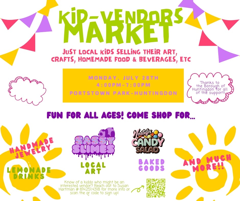 The Kid-Vendors Market is coming to Portstown Park in Huntingdon on Monday, July 28th from 4:00 to 7:00 p.m., and they are looking for awesome kid vendors to join!