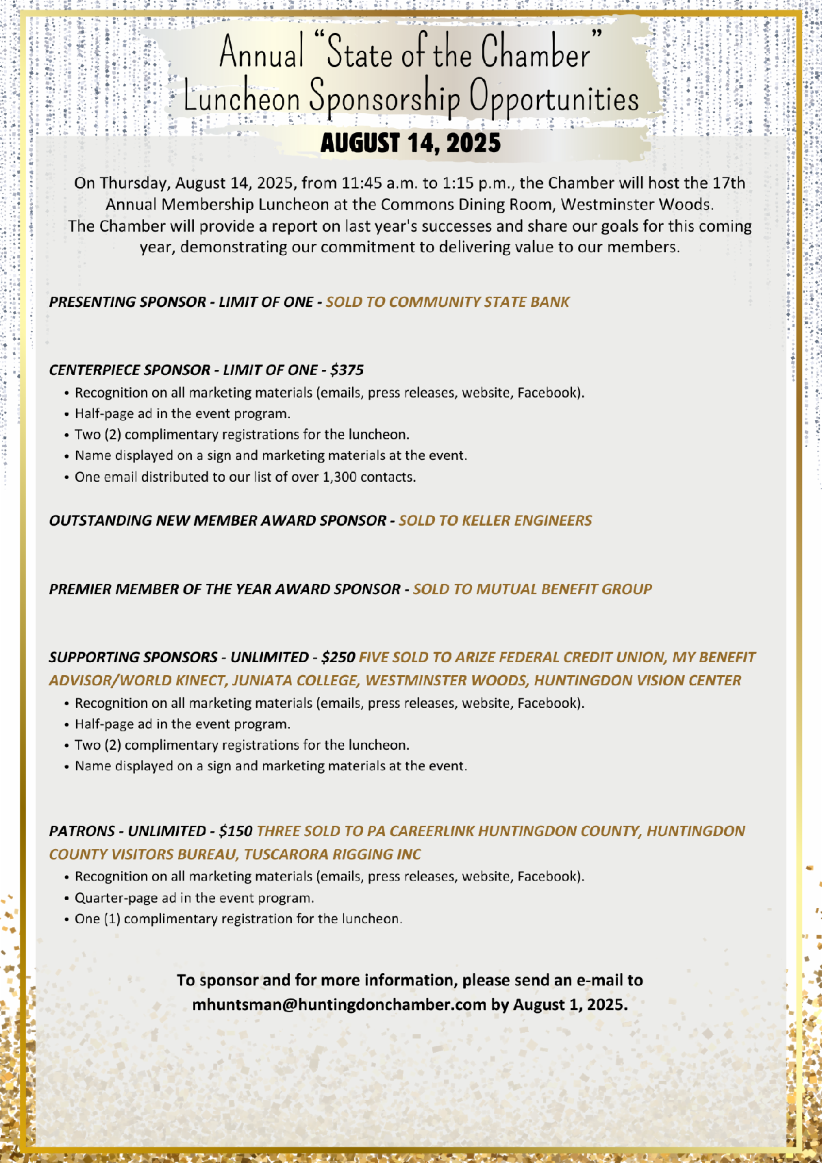 Deadline for all nominations is August 27, 2025. Nominations should be submitted directly to MacKenzie at mhuntsman@huntingdonchamber.com and may be on the official nomination form or attached as a Word document.