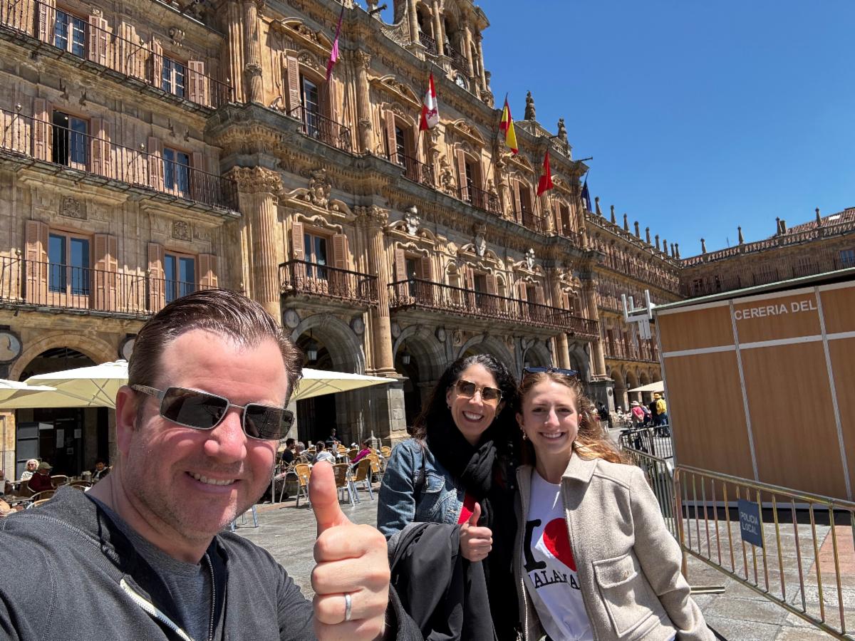 Our first stop was Salamanca. The University of Salamanca was founded in 1218. That’s not a typo. It’s older than the Aztec Empire. Walking its stone corridors and towering buildings reminded me how recent American history really is. In the U.S., “historic” usually means built in 1850. In Salamanca, that’s considered new construction! While enjoying the sights and culture there, I also managed to grab a selfie with the family at city hall.