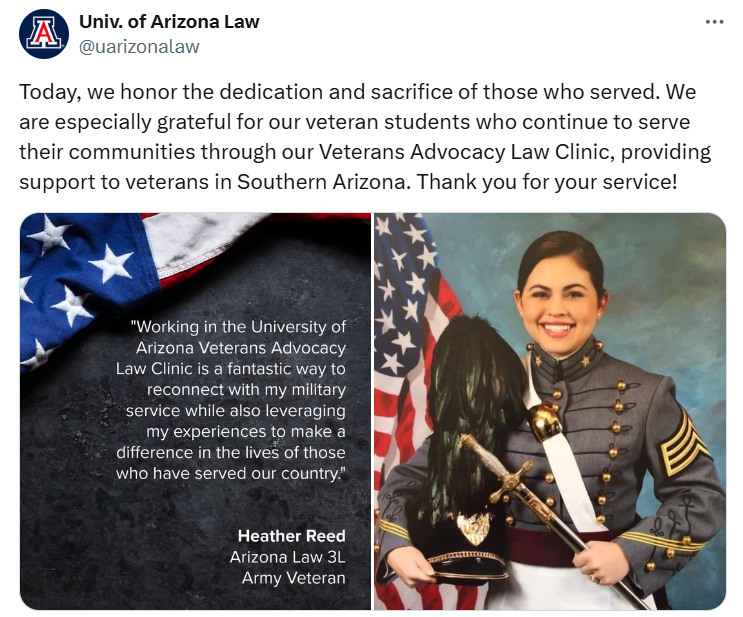 Second, I also work on administrative issues for veterans, who may need help obtaining VA benefits, navigating military records and regulations, etc. For example, this semester another student and I are representing a veteran in a lawsuit against the military that we expect to file in the U.S. District Court for the District of Arizona. Being able to work as a lawyer on a lawsuit in federal court while only a law student is pretty thrilling!