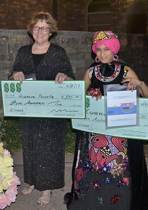 Mary at a Soroptimist fundraiser in 2017, showing her winning "Trash 2 Fashion" design on her model. Mary says this represents the joys of creative activity and service possible in retirement.
