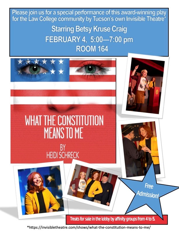 On Tuesday, February 4, Arizona Law will host a free, one-night-only performance of the award-winning play, “What the Constitution Means to Me,” by Tucson’s Invisible Theatre, starring Managing Artistic Director Betsy Kruse Craig.