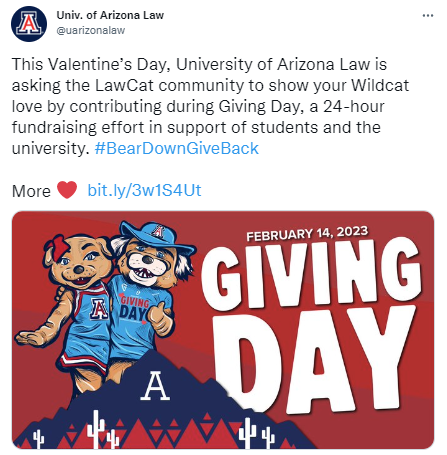University of Arizona Law maintains one of the lowest law school tuition rates in the country, and each year roughly 92% of JD students receive a scholarship. With your help, we can remove financial barriers and put the dream of a legal career within reach for every student.